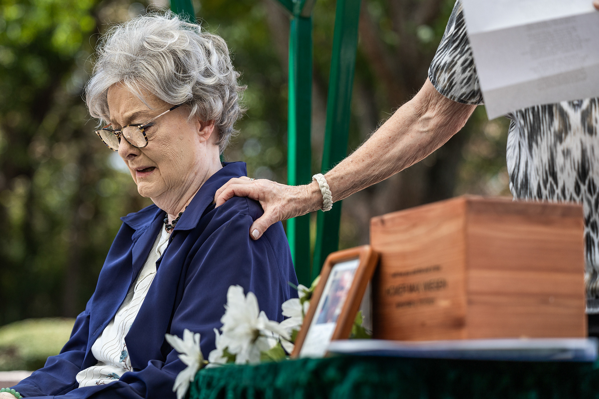 Elizabeth Joyce, the fiancé of former Denton resident Homer Max Wiesen, becomes emotional as her life-long friend Barbara Cole reads a poem in memory of Wiesen during his memorial service at Roselawn Memorial Park in Denton on Saturday, Sept. 16, 2023. Wiesen died on July 27 in his home after his A/C unit broke in the middle of a record heat wave in North Texas.