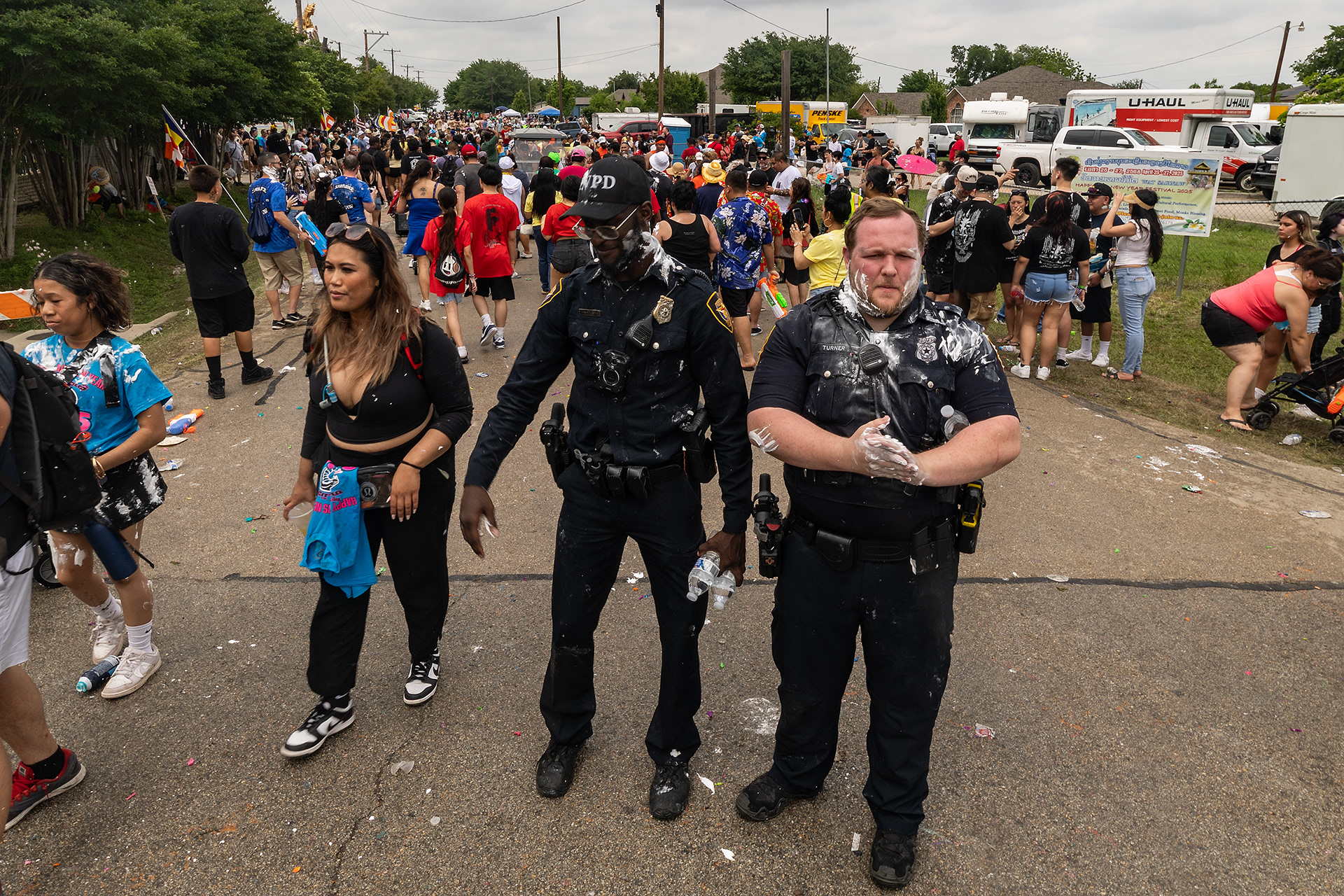 Fort Worth Police Department police officers become covered in shaving cream with the parade attendees during the Lao New Year parade on the third day of the Lao New Year festival at Wat Lao Thepnimith Temple in Saginaw on Sunday, April 27, 2025.