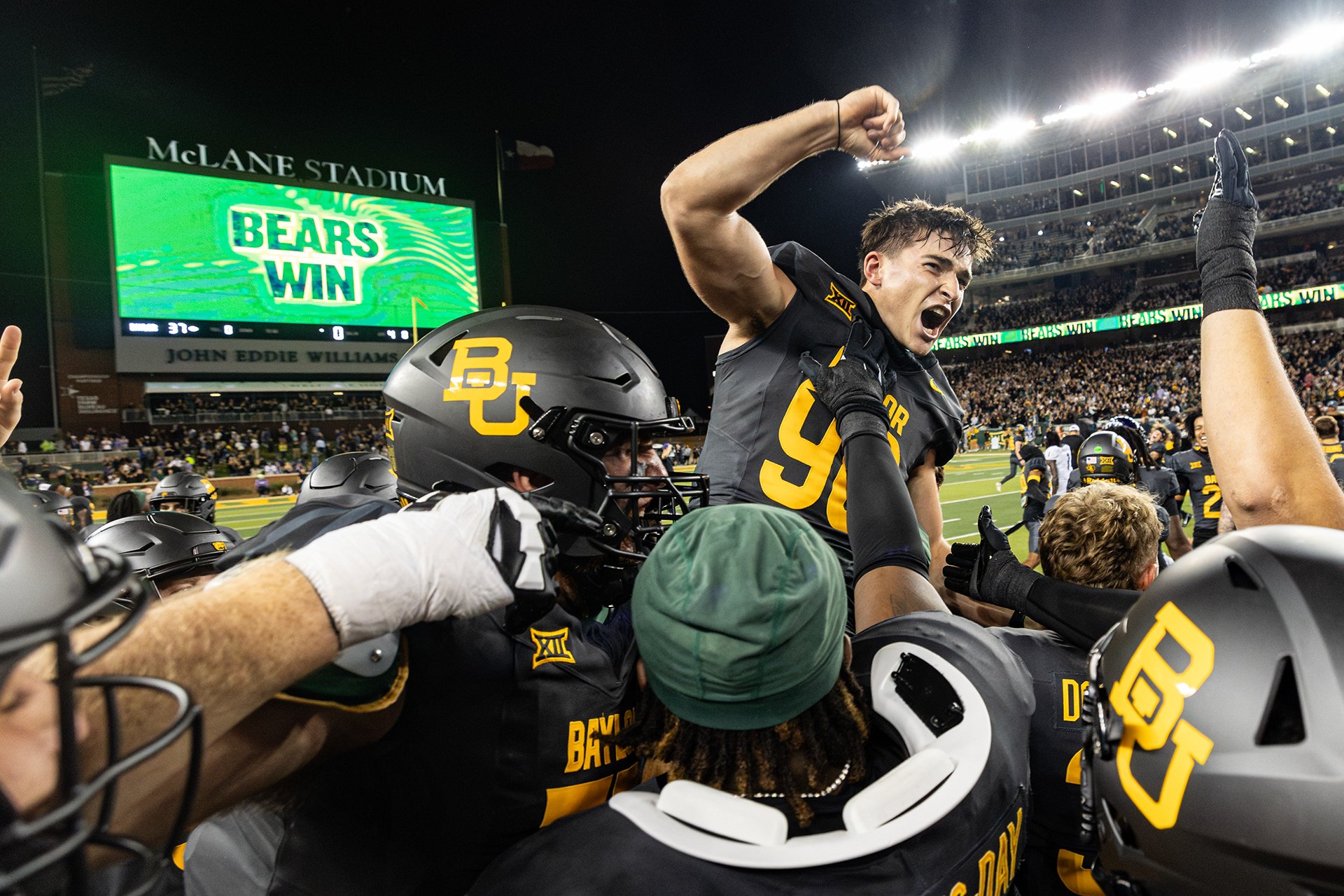 Baylor kicker Isaiah Hankins (98) celebrates with his teammates after kicking the game winning field goal at the end of regulation to defeat rival TCU 37-34 in an NCAA football game at McLane Stadium in Waco on Saturday, Nov. 2, 2024.