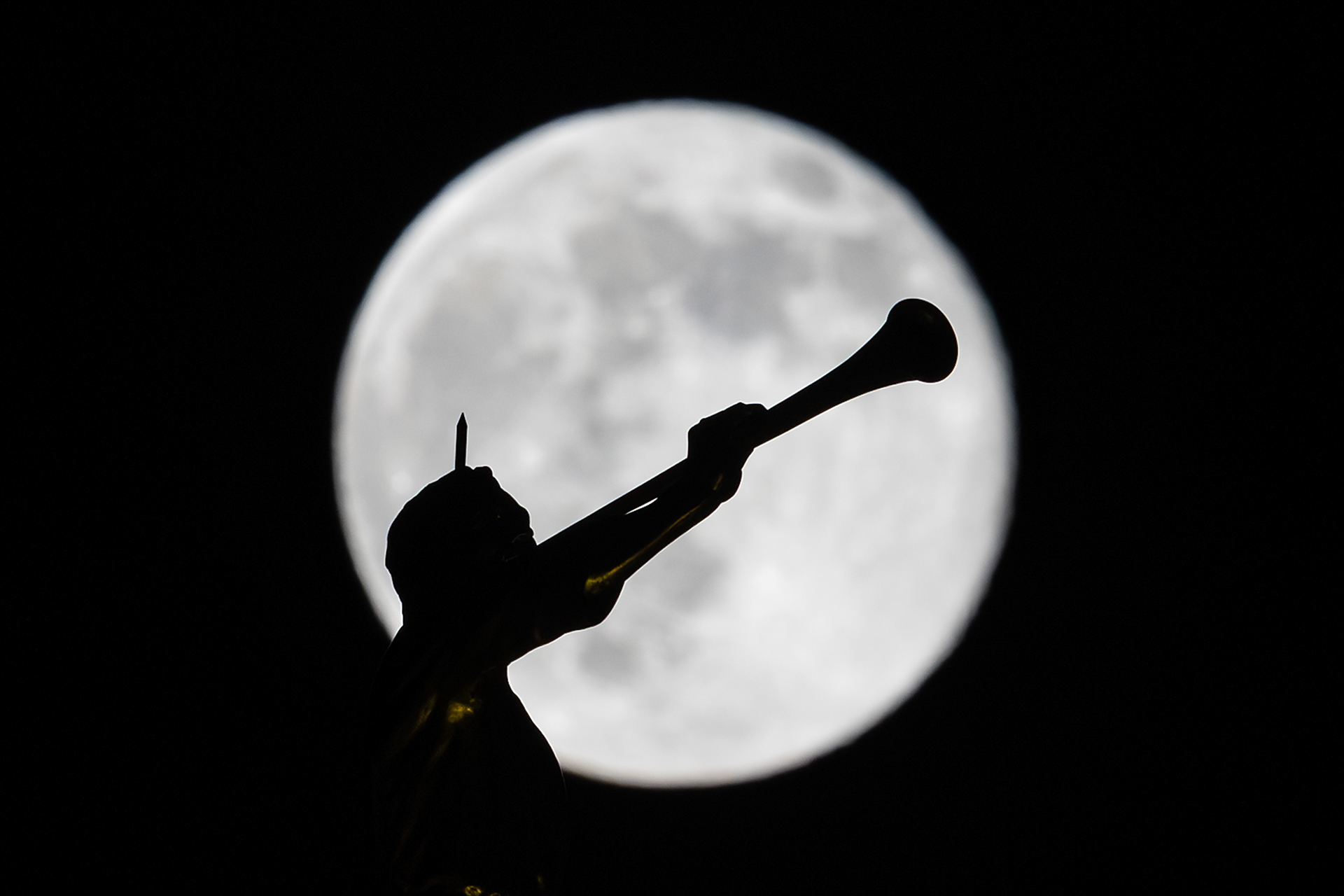 A statue of the Angel Moroni is seen as the Beaver Super Moon rises behind it at the Dallas Texas Temple in Dallas on Wednesday, Nov. 5, 2025.