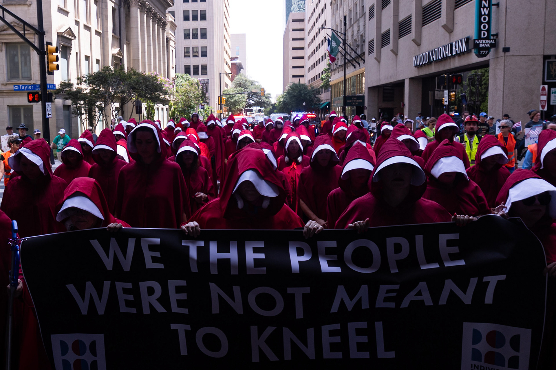 Protesters dressed in Handmaids outfits march in downtown Fort Worth in the March of Dissent hosted by Indivisible 12 on June 14, 2025.