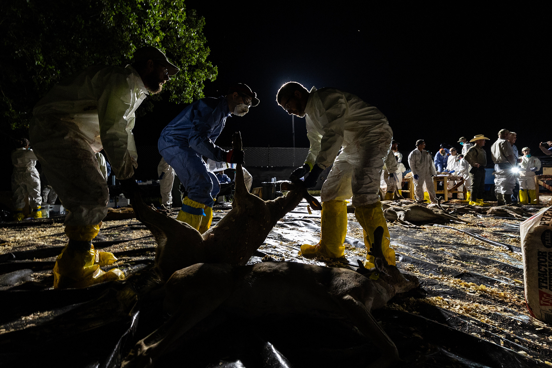 Biologists carry the carcass of a whitetail deer during a deer depopulation at RW Trophy Ranch in Terrell on Tuesday, May 28, 2024. The Texas Parks and Wildlife Department shot and killed about 250 captive whitetail deer to manage spread of a contagious deer disease in May of 2024. Robert Williams, a deer breeder and owner of RW Trophy Ranch, spent years fighting the state’s order, even as CWD cases continued to rise on the ranch.