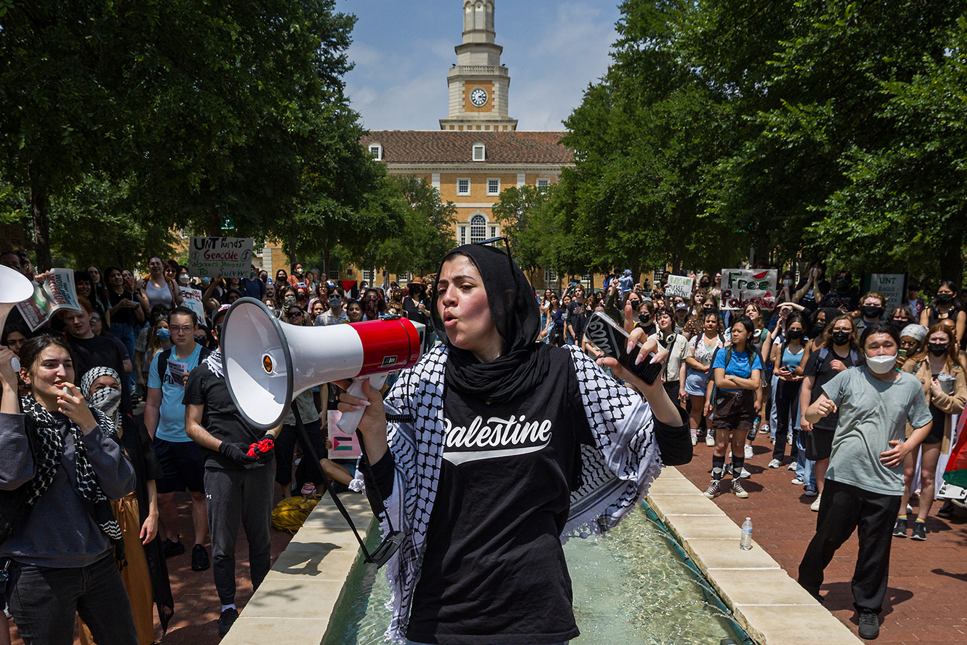 Malak, a student organizer with the Palestine Solidarity Committee at the University of North Texas who preferred to use their first time, rallies the crowd gathered for the Campus Wide Walkout for Gaza at the campus Library mall on Tuesday, April 30, 2024.