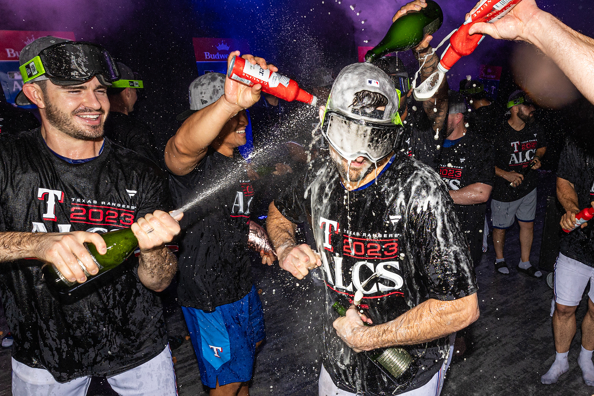 Texas Rangers pitcher Nathan Eovaldi gets beer and champagne poured on him while celebrating a win in game three to clinch the ALDS between the Texas Rangers and Baltimore Orioles at Globe Life Field in Arlington on Tuesday, Oct. 10, 2023.