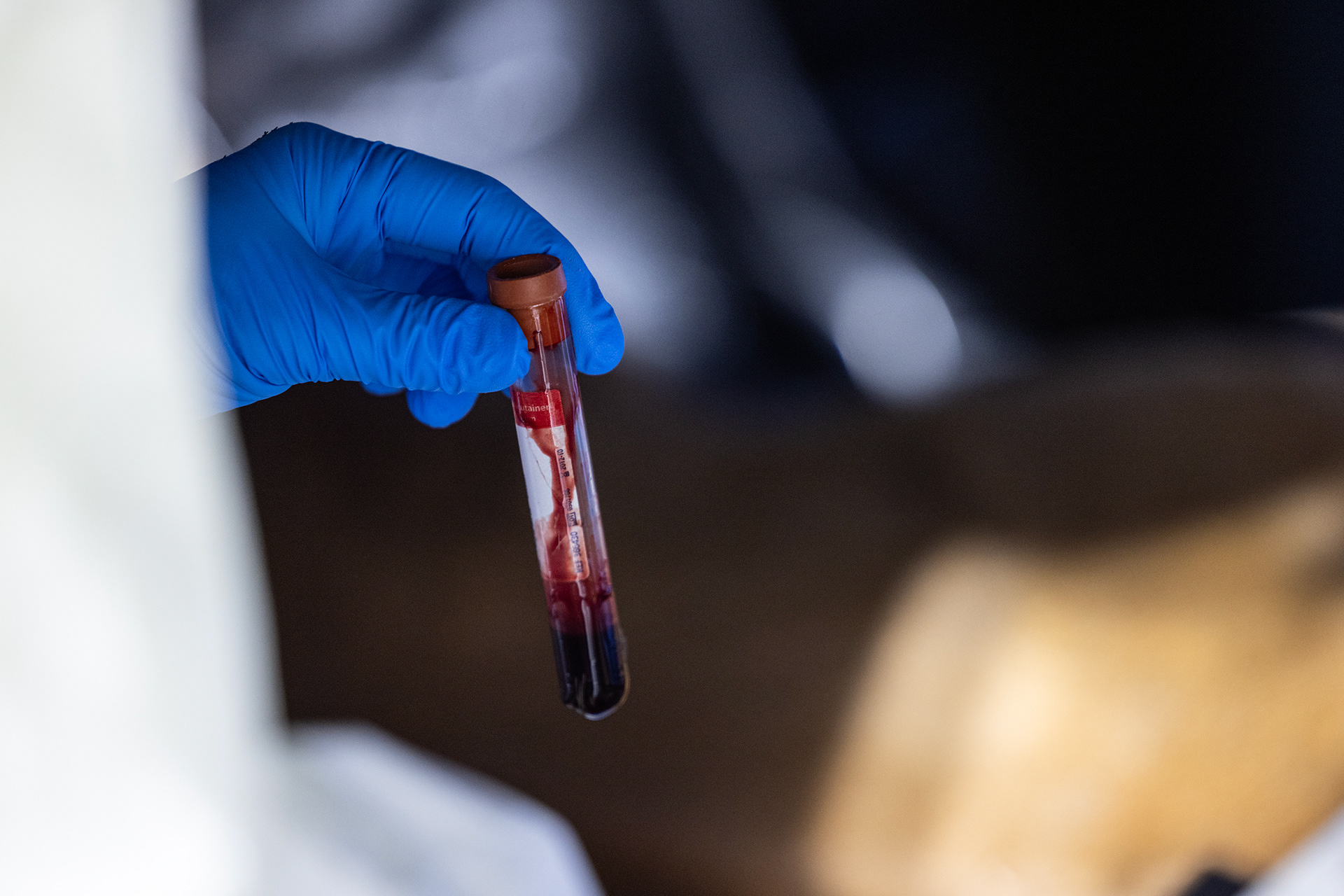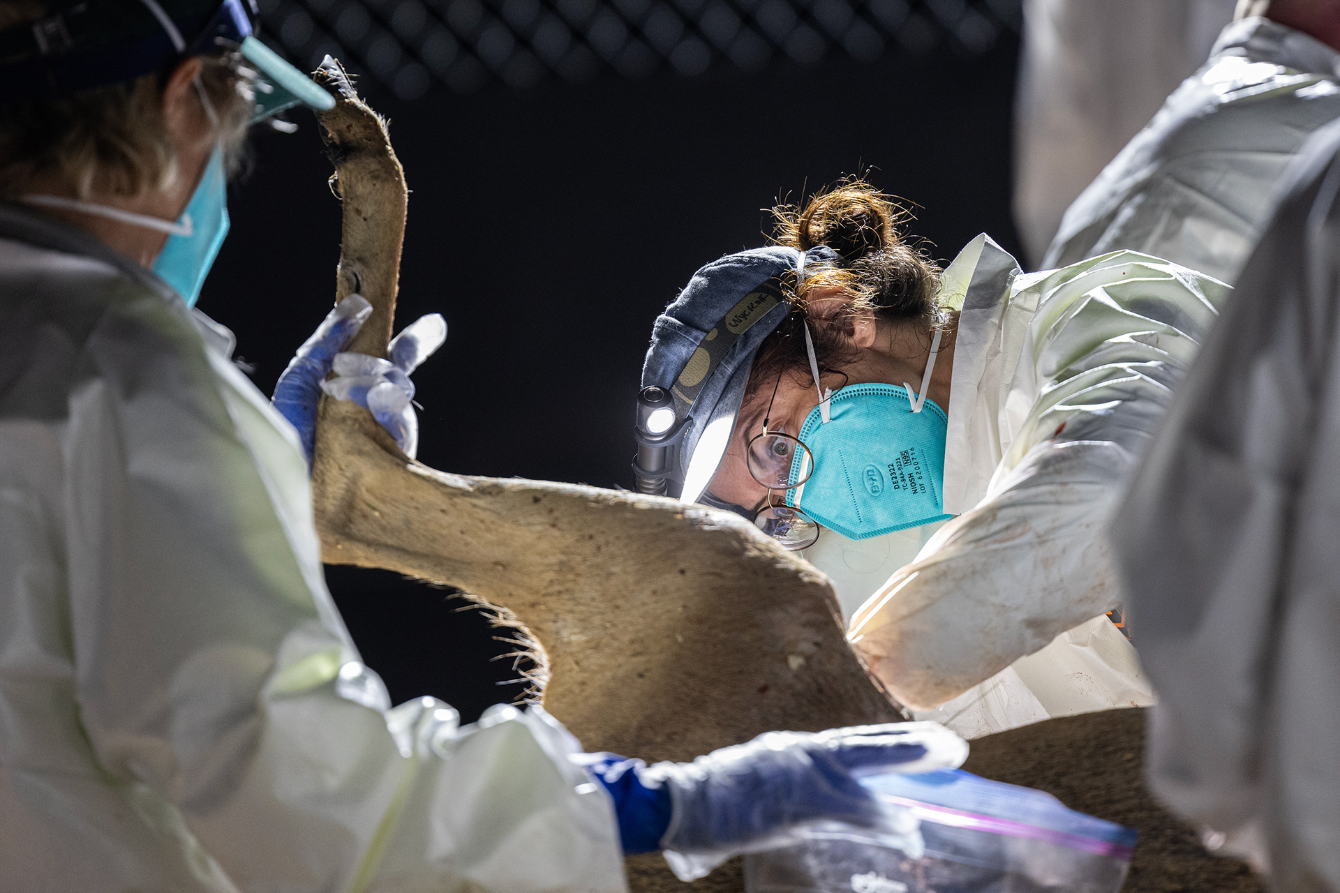 A blood sample is taken from one of the carcasses of a whitetail deer during a deer depopulation at RW Trophy Ranch in Terrell on Tuesday, May 28, 2024. The deer of Williams’s ranch in Hunt County were killed by the Texas Parks and Wildlife Department in order to manage a highly contagious deer-specific disease called chronic wasting disease.