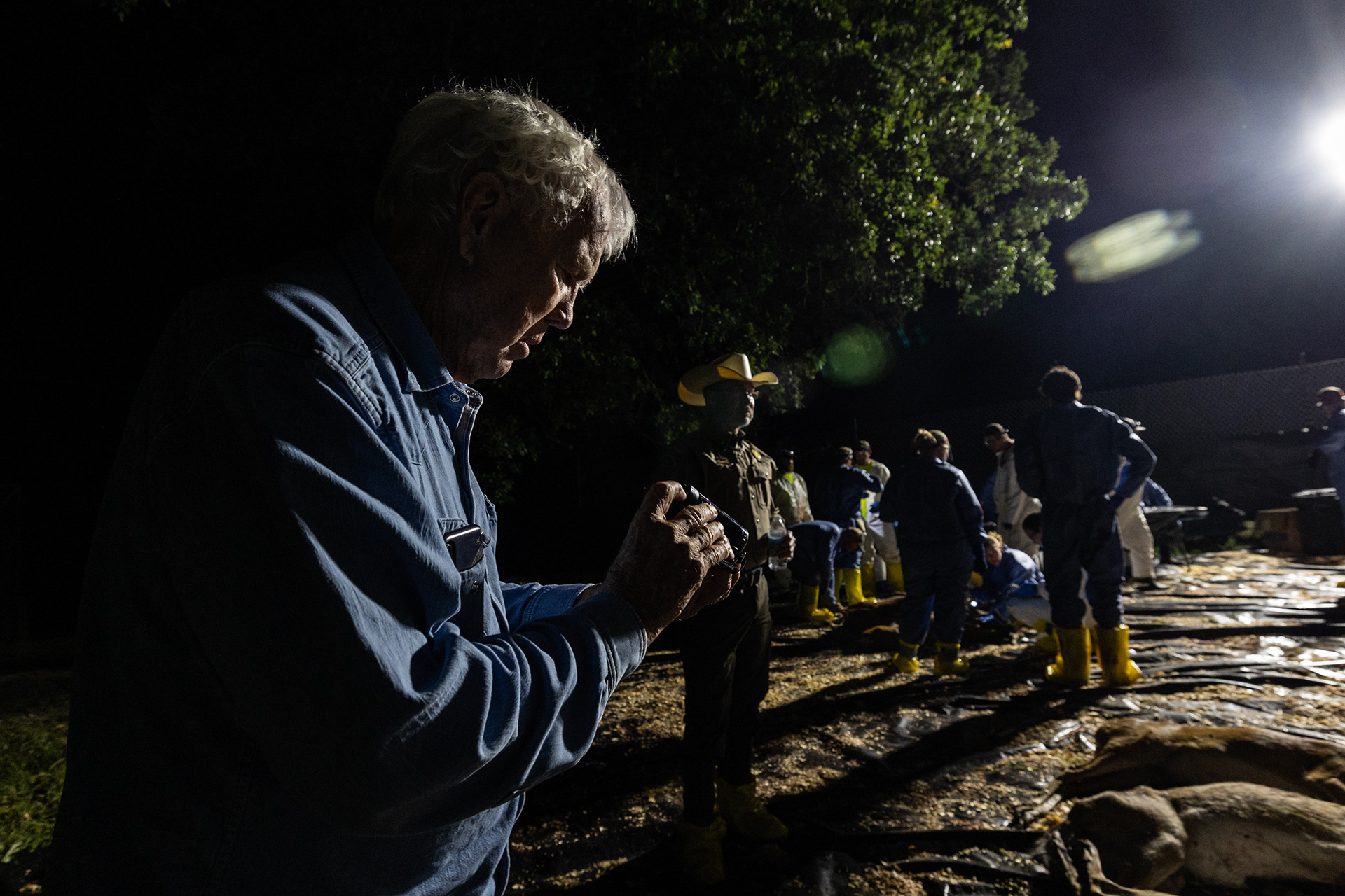 Ranch owner Robert Williams watches as work on the carcasses of his whitetail deer during a deer depopulation at RW Trophy Ranch in Terrell on Tuesday, May 28, 2024. The deer of Williams’s ranch in Hunt County were killed by the Texas Parks and Wildlife Department in order to manage a highly contagious deer-specific disease called chronic wasting disease.