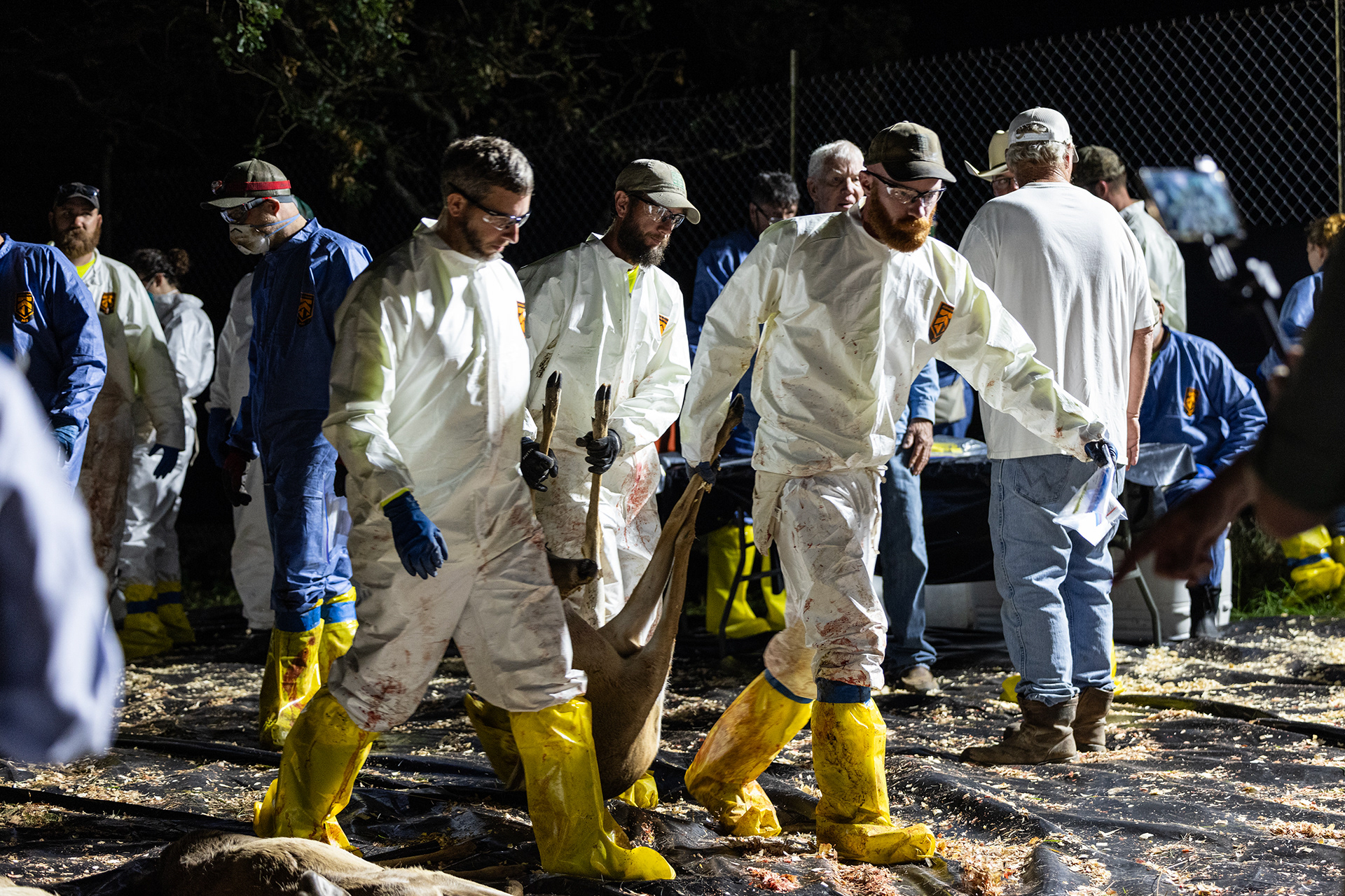 State-hired biologists carry a whitetail deer carcass during a deer depopulation at RW Trophy Ranch in Terrell on Tuesday, May 28, 2024. The deer of Williams’s ranch in Hunt County were killed by the Texas Parks and Wildlife Department in order to manage a highly contagious deer-specific disease called chronic wasting disease.