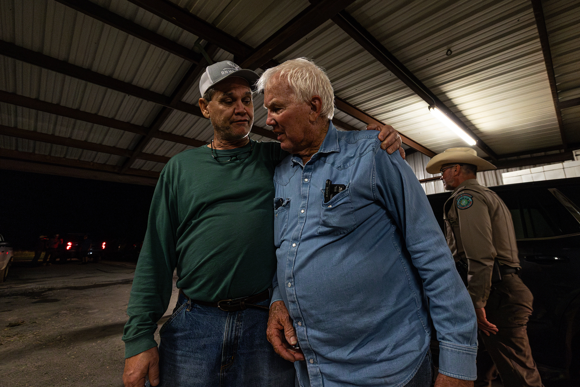 Boyd Nutt, a local deer breeder, consoles his close friend Robert Williams after Williams saw the dead bodies of his deer after the depopulation commenced at RW Trophy Ranch in Terrell on Tuesday, May 28, 2024. The deer of Williams’s ranch in Hunt County were killed by the Texas Parks and Wildlife Department in order to manage a highly contagious deer-specific disease called chronic wasting disease.