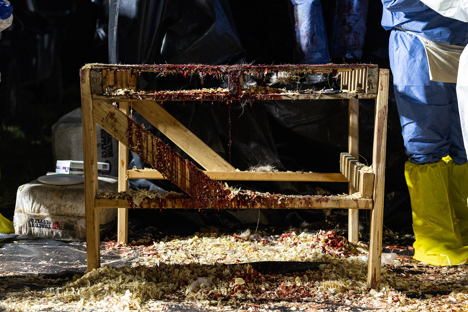 Blood stains the wooden work table where biologists work on the carcasses of whitetail deer during a deer depopulation at RW Trophy Ranch in Terrell on Tuesday, May 28, 2024. The deer of Williams’s ranch in Hunt County were killed by the Texas Parks and Wildlife Department in order to manage a highly contagious deer-specific disease called chronic wasting disease.