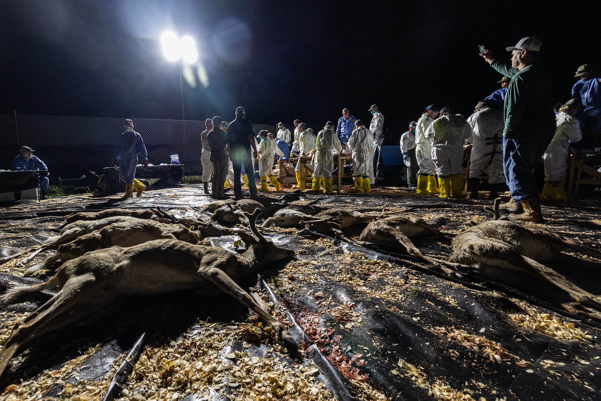 A biologist works on a whitetail deer carcass during a deer depopulation at RW Trophy Ranch in Terrell on Tuesday, May 28, 2024. The deer of Williams’s ranch in Hunt County were killed by the Texas Parks and Wildlife Department in order to manage a highly contagious deer-specific disease called chronic wasting disease.